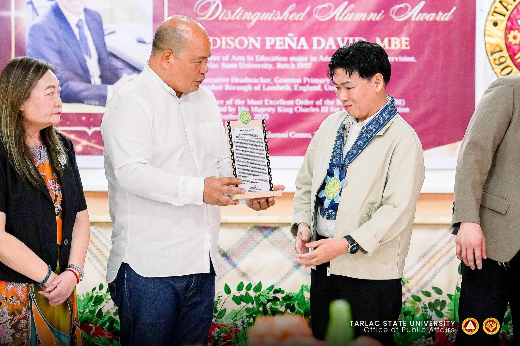 The Tarlac State University Alumni Association honored Mr. Edison David with a "Distinguished Alumni Award" after being awarded the Member of the Most Excellent Order of the British Empire (MBE) by His Majesty King Charles III in the 2025 New Year Honours List.